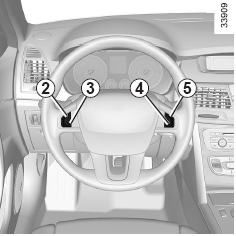 속도가 저장되어 있고 주행 속도가 시속 30km/h 이상일 때, 주행 조건(교통 상태, 노면 상태, 기상 상태 등)이 적절한 경우 스위치 5(R)를 눌러 크루즈 컨트롤 기능을 재작동 시킬 수 있습니다(계기판에 "크루즈컨트롤" 메시지와 함께 저장된 속도가 km/h단위로 표시됩니다).