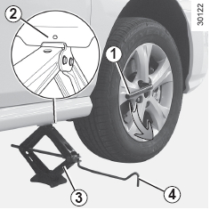 - 잭 3을 수평으로 놓습니다. 잭 헤드가 반드시 교환하려는 타이어에서 가장 가까운 잭업 포인트 2(살짝 아래로 돌출되어 있음)에 오도록 합니다.