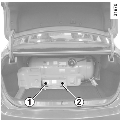 - LPG 탱크의 충전밸브 1(녹색)과 취출밸브 2(적색)를 시계 방향으로 돌려 잠그고 연료계통의 누출을 점검합니다.