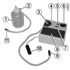 - 플러그 10을 차량의 파워 아웃렛에 연결합니다("파워 아웃렛" 을 참조하십시오). 스위치 7을 눌러 권장 공기압이 될 때까지 타이어에 공기를 주입합니다(운전석 도어 옆에 부착된 라벨 참조).