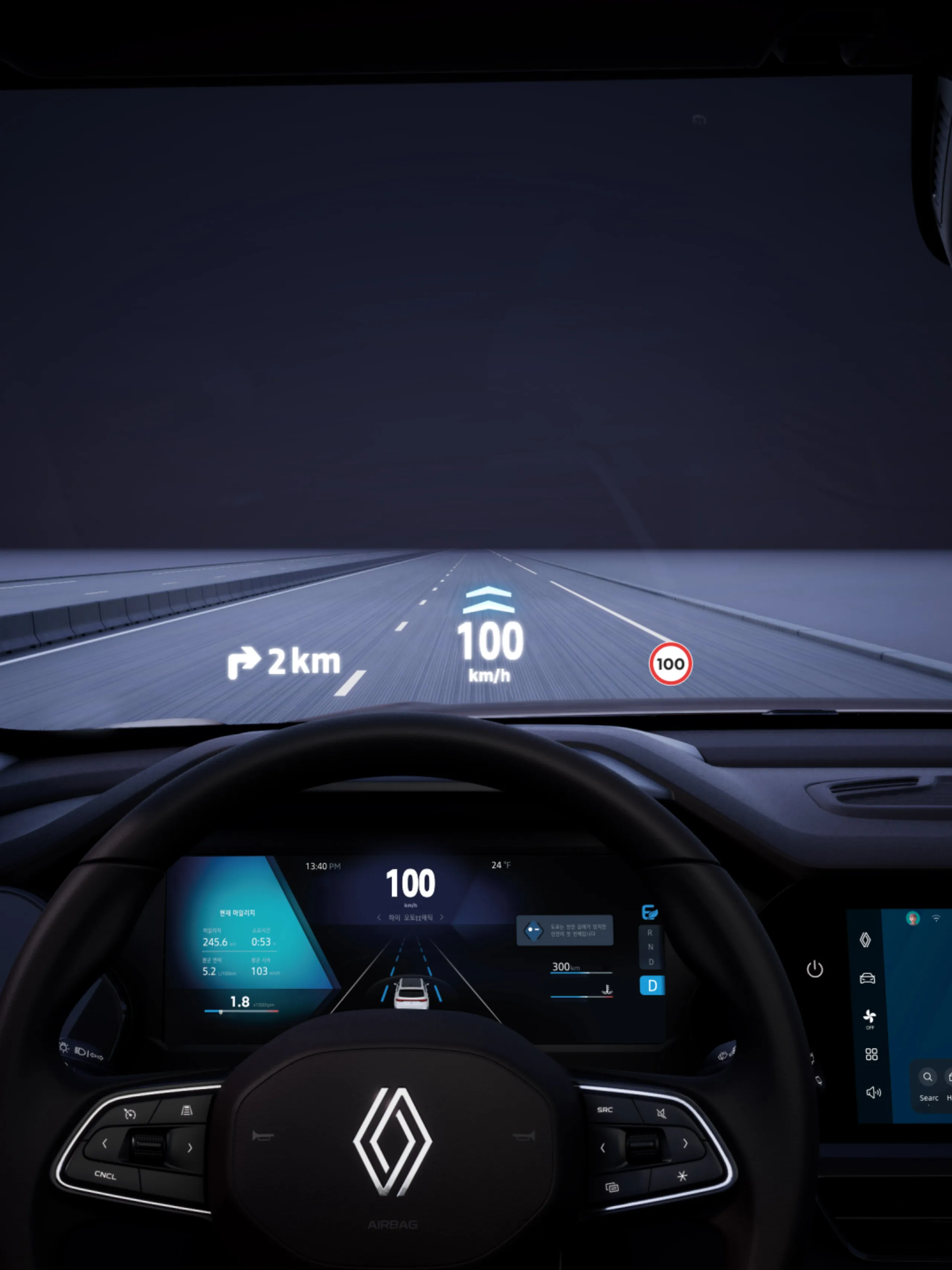 증강현실 헤드업 디스플레이 헤드업 디스플레이를 통해 운전자는 도로에서 눈을 떼지 않고도 시야 내에서 주행 정보를 쉽게 확인할 수 있습니다.